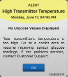 In extreme temperature, the system will present a High Sensor or High Transmitter Temperature Alert. Once the condition changes back to normal operating range, the system will display glucose values again.