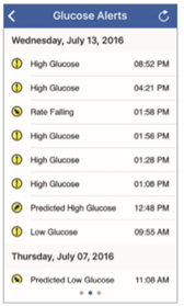 These alerts monitor events such as the rising or falling of glucose rates as well as low or high, and predicted low or high, glucose values (hypoglycemia or hyperglycemia).