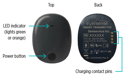 The Eversense® E3 Smart Transmitter is a removable transmitter worn externally over the sensor. It wirelessly powers the sensor and collects glucose data via Near-Field Communication (NFC). It wirelessly sends glucose data (via Bluetooth) to the Eversense® Mobile App. It has a rechargeable battery and is warranted for one year.