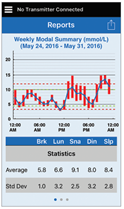 The Weekly Modal Summary report shows your last seven days of glucose readings summarized in a