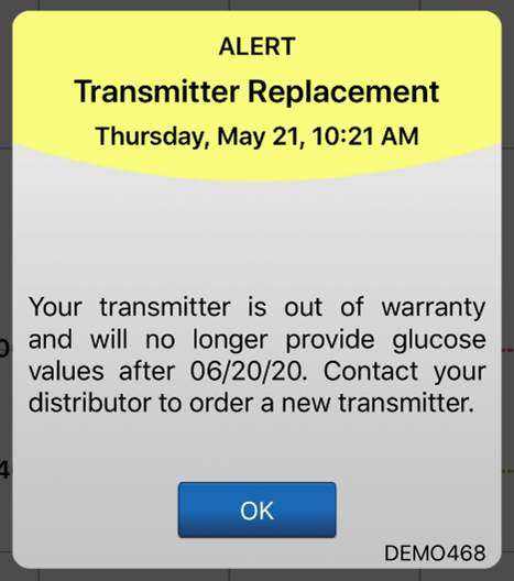 The system will send out a notification on day 330, and alerts on days 366, 395, and 396 reminding the user to order a new smart transmitter. After day 395, the smart transmitter will no longer be able to provide CGM data to you.